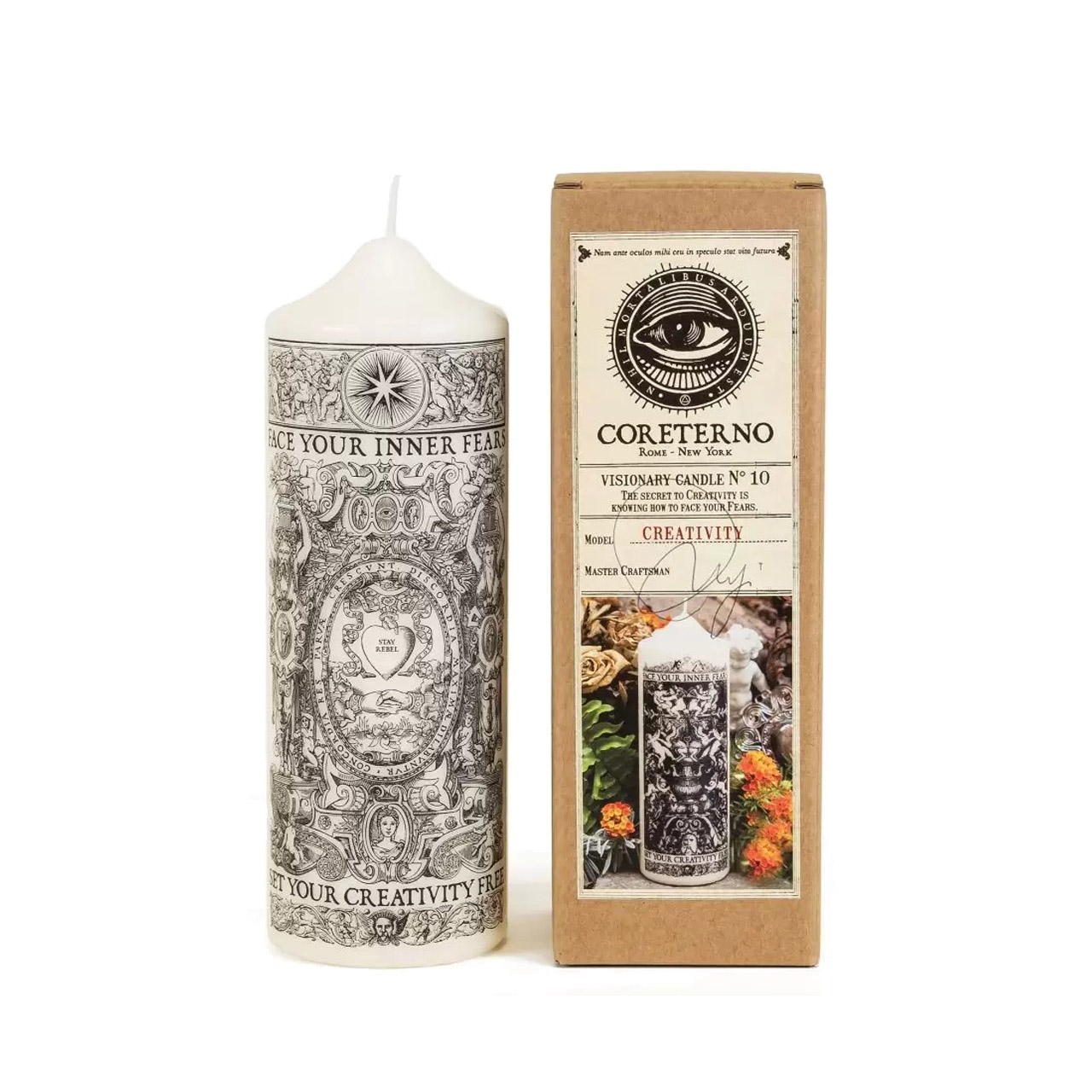 La candela Creativity riporta la frase ‘Face your inner fears. Let your creativity free.’ Un invito ad affrontare le tue paure, perché lì troverai la tua creatività. Le Visionary Pillar Candles di Coreterno rappresentano il trionfo e la protezione della luce sulle tenebre e diffondono messaggi potenti e positivi che confortano il cuore e la mente. Sono realizzate secondo l’antica tradizione italiana, con cera minerale e vegetale inodore. Lo stoppino è in cotone naturale al 100% e la durata della candela è di oltre 60 ore. Diametro 7cm, altezza 20cm.