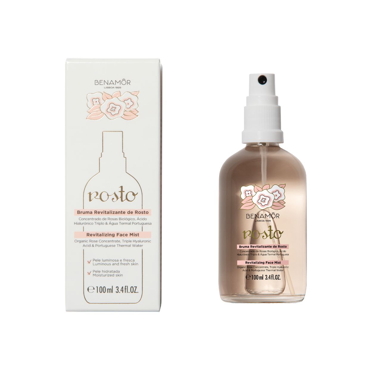 Formulato con concentrato di rosa biologico, triplo acido ialuronico e acqua minerale naturale delle principali sorgenti termali del Portogallo, il Revitalizing Face Mist promette di idratare, levigare e illuminare la tua pelle. Sarà il tuo nuovo prodotto preferito nella tua routine quotidiana! Questo spray per il viso sarà un potente alleato nella tua routine e ti aiuterà a mantenere la tua pelle idratata, rinfrescata e sana. Modo d’uso: puoi usarlo prima o dopo aver applicato la crema per il viso, sopra il trucco o sulla pelle pulita. Spruzzalo a circa 30 centimetri dal viso, con gli occhi chiusi. Non è necessario rimuovere l'eccesso. Puoi riapplicarlo più volte al giorno per rinforzare l'idratazione. Dermatologicamente testato.